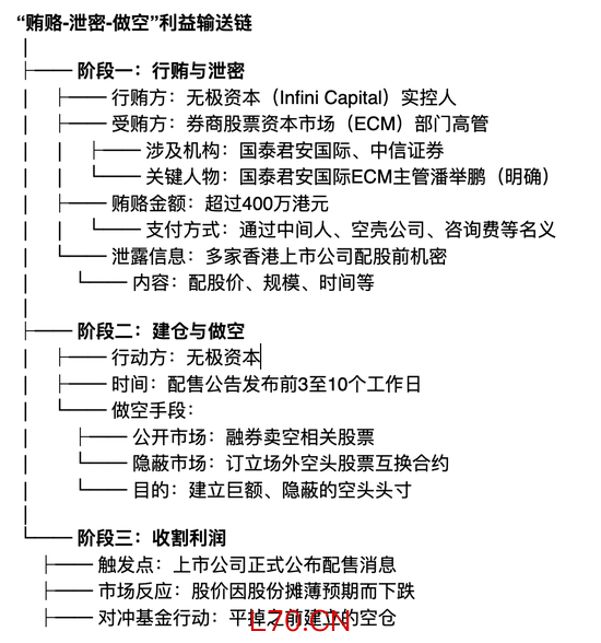 自此,香港‘导火线行动’中核心作案手法基本清晰,勾勒出一条“贿赂-泄密-做空”的利益输送链。