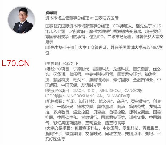国泰君安国际的潘举鹏,主管ECM部门(股票资本市场部),同时负责二级市场配售及IPO新股发行(一级市场)的定价与销售。