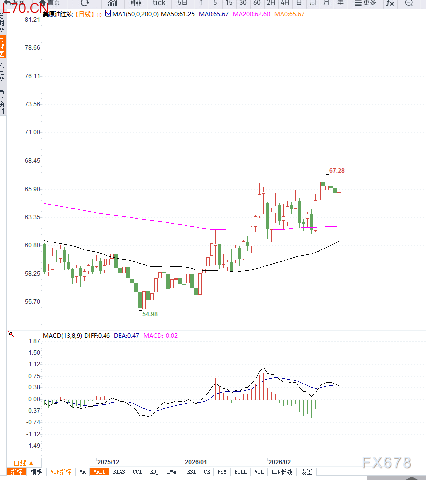 从日线结构观察,WTI原油当前仍处于中期震荡区间内部运行,价格波动核心区间维持在60美元至72美元之间。近期油价连续回落但跌幅有限,说明下方承接力量仍在发挥作用。
