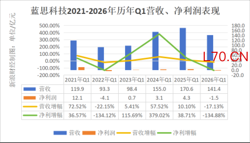 蓝思科技发布2026年一季度业绩报告显示,今年一季度,公司营收141.4亿元,同比下滑17.13%;归母净利润由正转负为亏损1.5亿元,同比下滑134.88%。