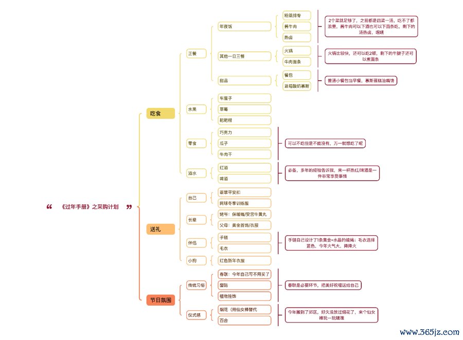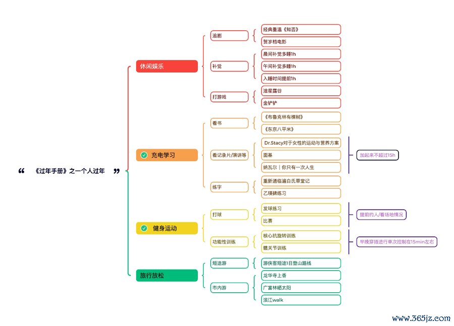 我是互联网从业者,工作之后,一有新想法就习惯写思维导图,《过年手册》是闪念间想到的。今年春节前一个月,我给自己做了一份详尽的《过年手册》,包括休闲娱乐、充电学习、健身运动、吃食、送礼等几个大部分。
