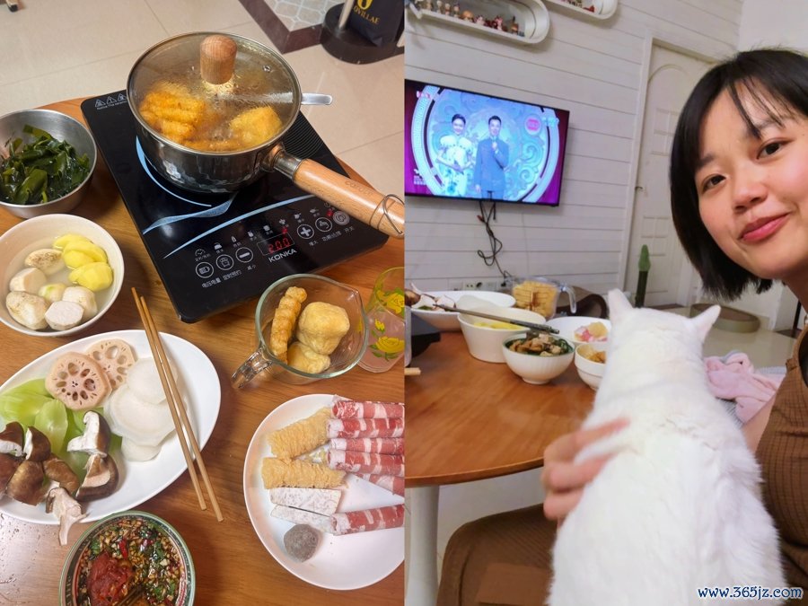 把电磁炉搬到客厅茶几上,锅里开始咕嘟咕嘟冒泡时,春晚还没开始。小猫跳上茶几,蹲在电磁炉旁边盯着翻滚的红汤,这简直是今年过年的高光时刻。