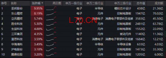 成份股方面,苹果产业链个股显著领涨,圣邦股份涨超9%,东山精密涨逾8%,立讯精密、胜宏科技、生益科技等个股大幅跟涨。