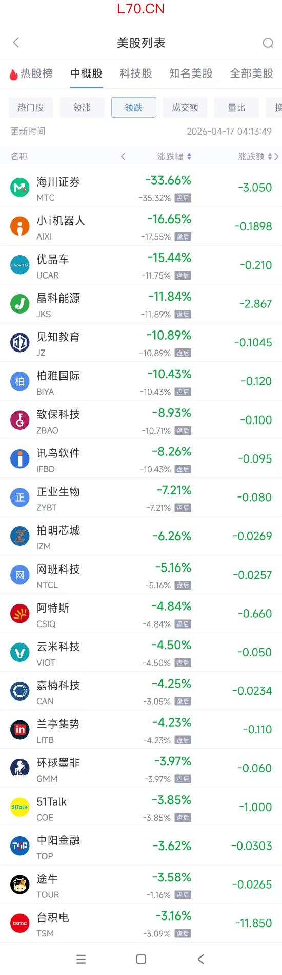 领跌中概股列表: